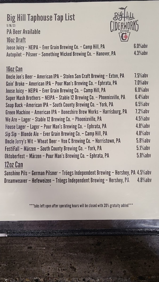 Welcome to Big Hill Ciderworks, a delightful cider haven nestled in the heart of Gardners, PA. This charming establishment offers a modern twist on hard ciders, boasting an array of medium-sweet options such as the Farmhouse Strawberry and Michaux Mule. Whether you’re savoring a glass or diving into an enticing tasting flight, the flavors here promise to elevate your palate.